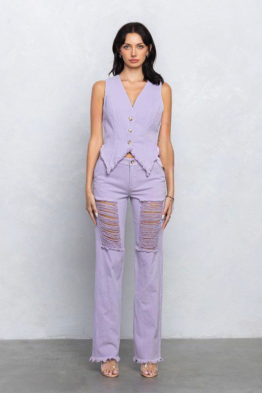 Conjunto chaleco y pantalón mezclilla suave stretch en cálido color lavanda 🪻